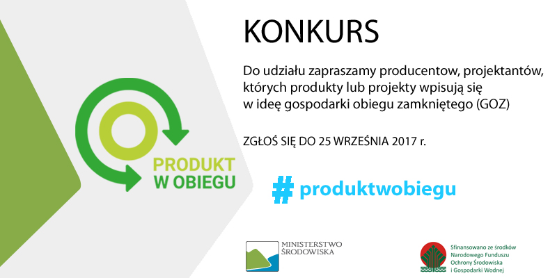 Konkurs Ministra Środowiska – Produkt w obiegu. Zgłoszenia przyjmowane są do 2 października 2017 r. Celem konkursu jest promocja i upowszechnianie osiągnięć w dziedzinie ekologicznego, zrównoważonego projektowania oraz zastosowania innowacyjnych rozwiązań w zakresie ponownego włączenia produktu do obiegu - po zakończeniu użytkowania w jego pierwotnej formie.