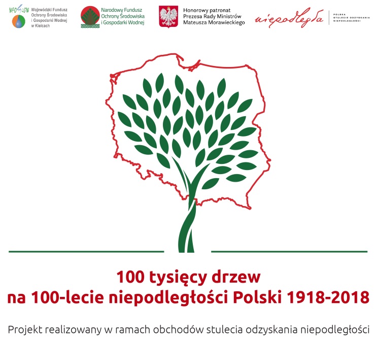 Zarząd WFOŚiGW w Kielcach serdecznie zaprasza do wzięcia udziału w ogólnopolskiej akcji „100 tysięcy drzew na 100 lecie niepodległości Polski 1918-2018” – to wielkie przedsięwzięcie patriotyczno-ekologiczne, które w dniach 7-11 września br. Narodowy Fundusz Ochrony Środowiska i Gospodarki Wodnej organizuje wraz z Funduszami Wojewódzkimi w tym z Wojewódzkim Funduszem Ochrony Środowiska i Gospodarki Wodnej w Kielcach.