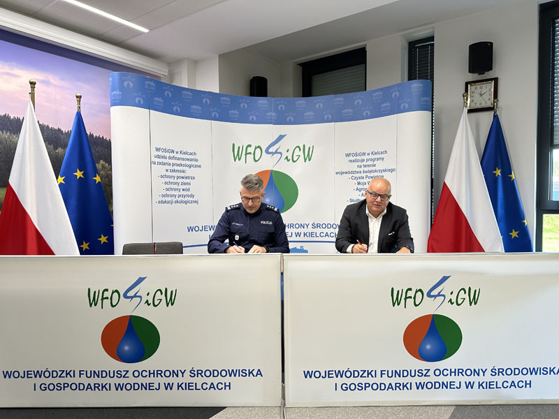 W dniu 4 listopada 2025 r. w siedzibie Wojewódzkiego Funduszu Ochrony Środowiska i Gospodarki Wodnej w Kielcach Pan Jacek Skórski - Prezes Zarządu Wojewódzkiego Funduszu Ochrony Środowiska i Gospodarki Wodnej w Kielcach i Pan Komendant Wojewódzki Policji w Kielcach insp. Zbigniew Nowak podpisali umowy na realizację zadań pn.: